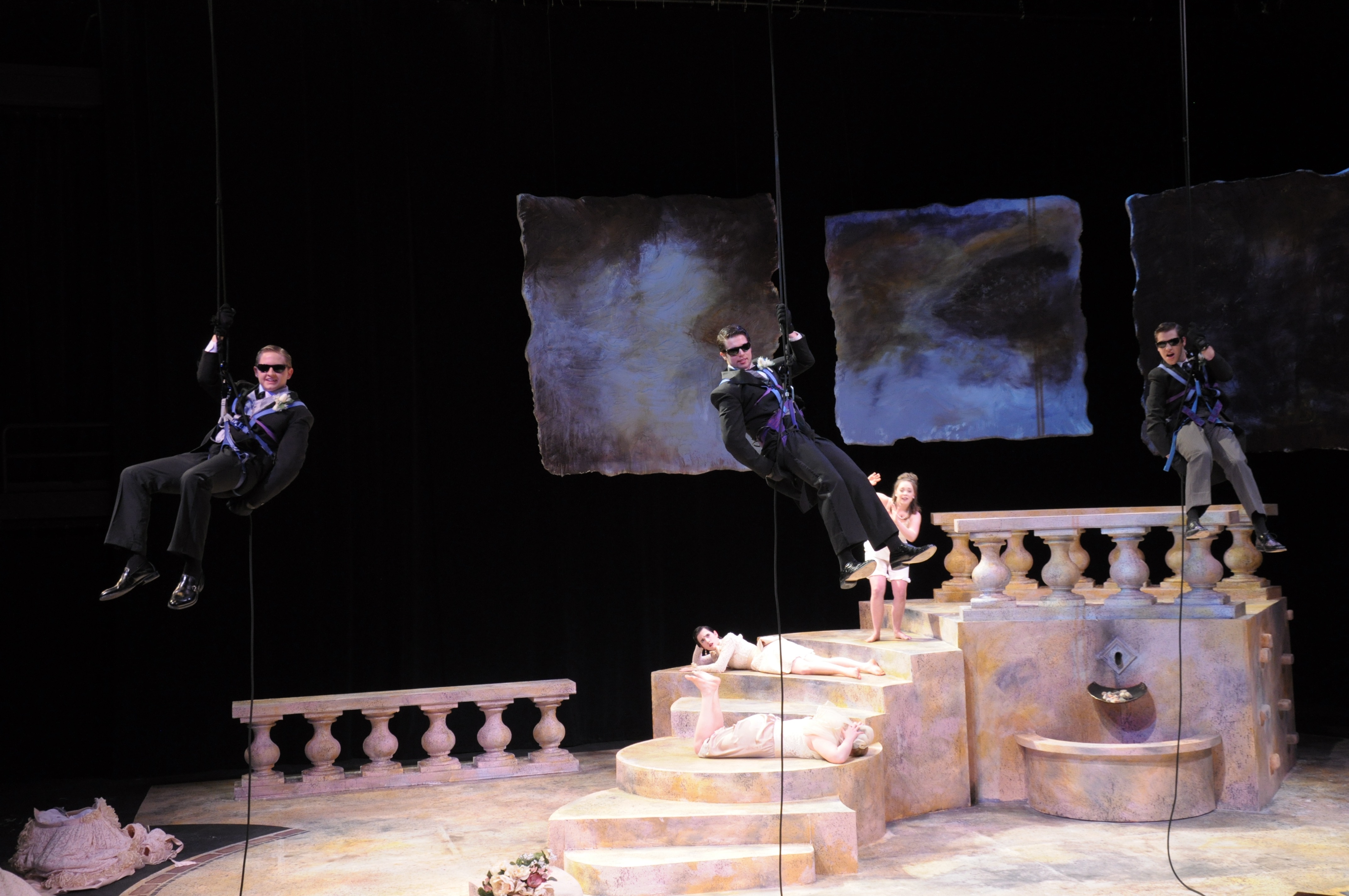 During the performance, three men enter the stage by rapelling in from above. While this is going on, an actress is giving a speech and loud music plays in the background. Panning is used in this sample to demonstrate the use of different speaker systems, with the right being above the stage and the left being behind and above the set. Photo: Bryson Kiser.